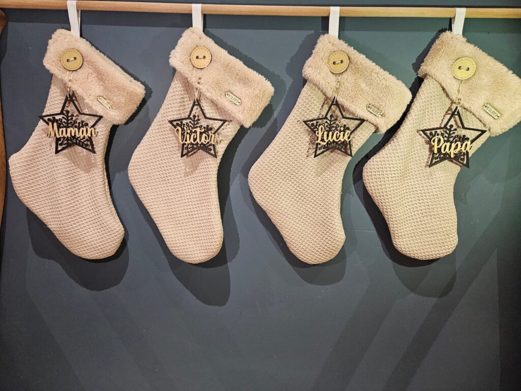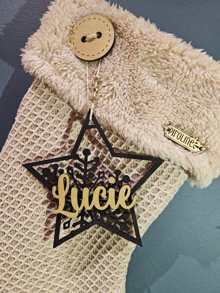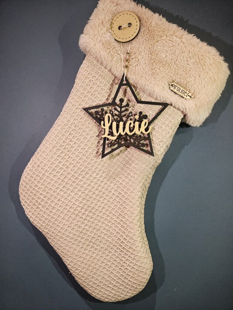 Cette chaussette de Noël, dessinée et cousue à la main, est ornée de jolis détails et d’une étoile en bois noire personnalisée avec un prénom doré.