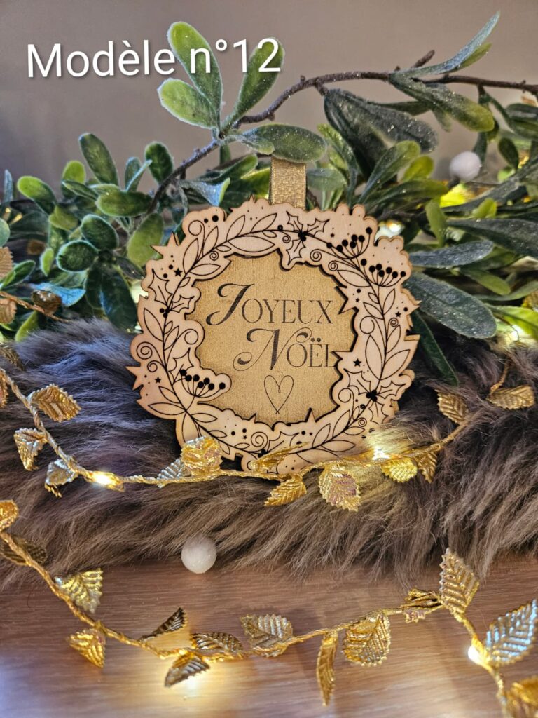 Ces boules de Noël en bois sont sublimées par un fond délicatement doré un joli ruban qui leur donne une touche d’élégance artisanale.