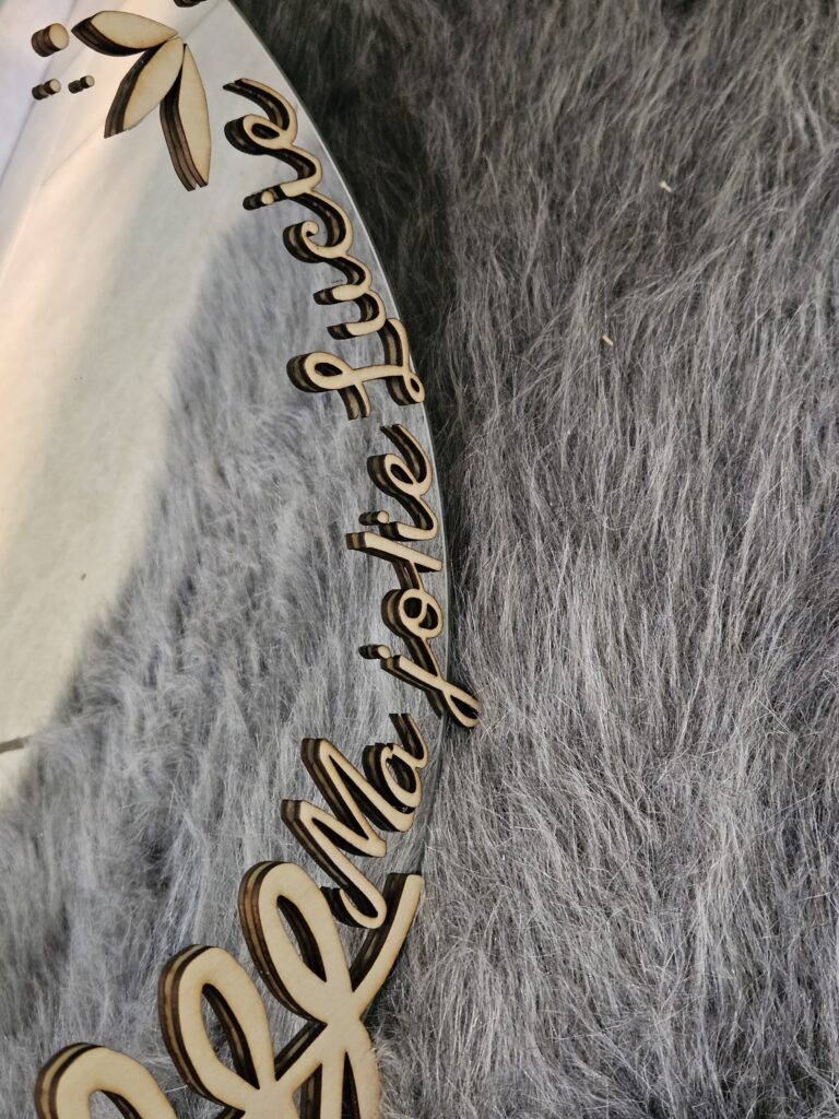 Un miroir rond orné de fleurs en bois dessinées par Piroline et découpées avec finesse grâce à la technologie laser, Je peux également graver vos mots doux et le prénom de votre enfant.