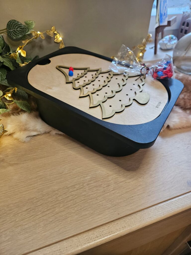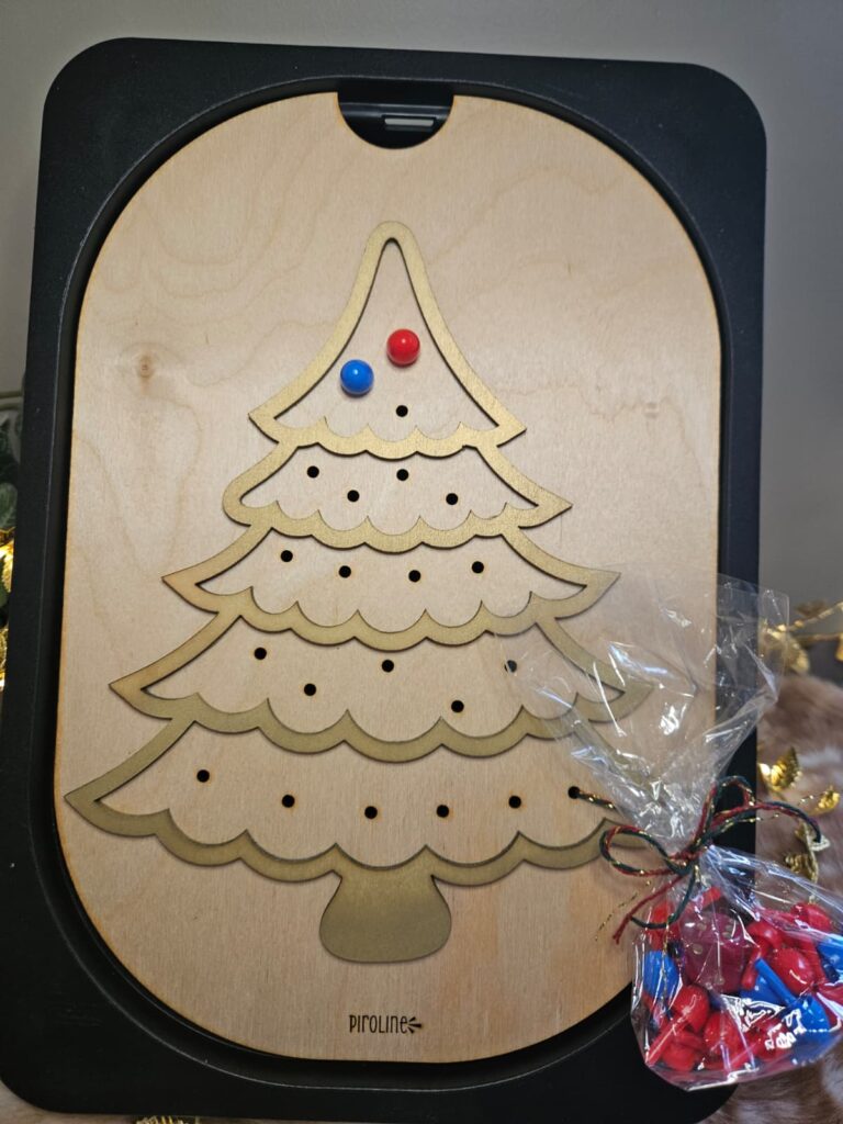 Le jouet comprend également un jeu simple et convivial : les pions sont répartis entre deux joueurs, chacun lance le dé à tour de rôle et place le nombre de pions indiqué par le dé sur le sapin. Le premier à ne plus en avoir, gagne la partie. Cette activité permet de travailler la gestion du tour de rôle, le respect des règles, … et permet surtout de partager un moment de plaisir ensemble.